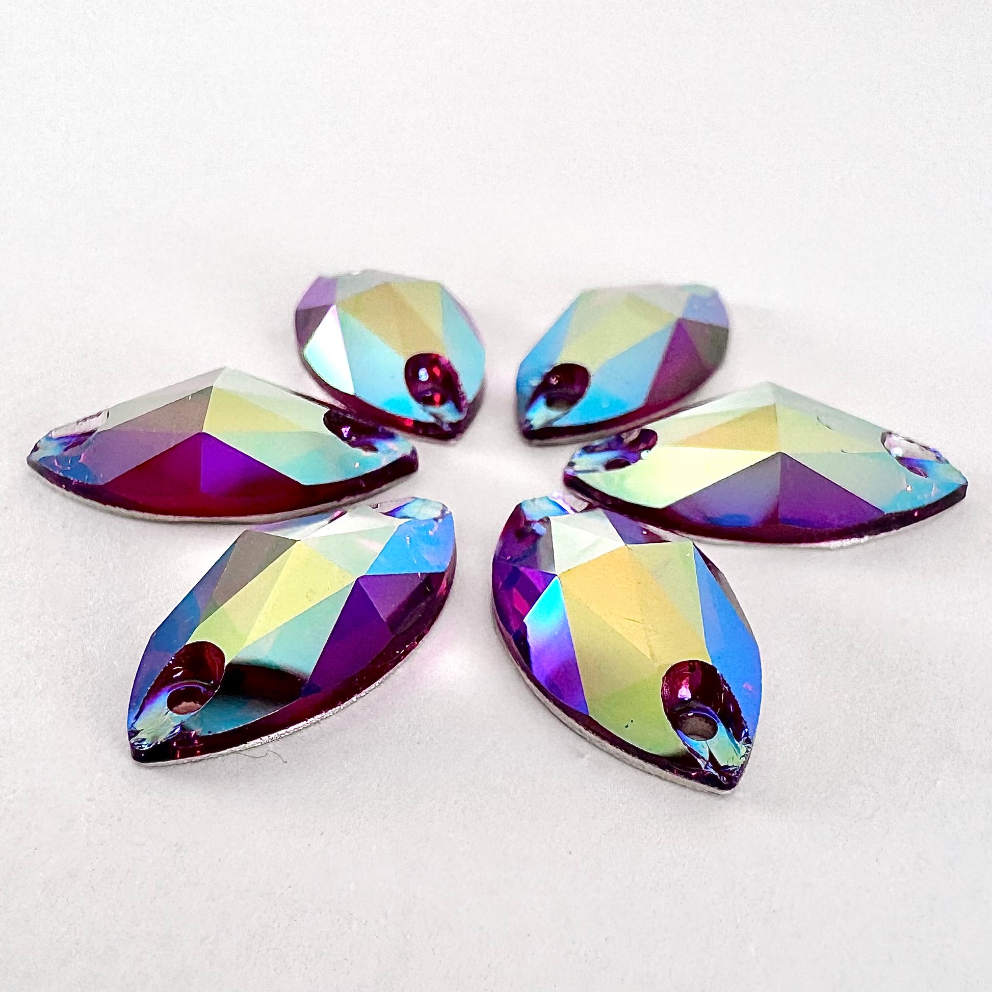 Each colour is presented with what looks like a coating of both cubic zirconia and an AB finish. Like colours with a CZ finish they stay true to their described colour, however as they also display an AB quality, they subtly throw an alternate reflected colour - and this varies depending on the shape chosen.