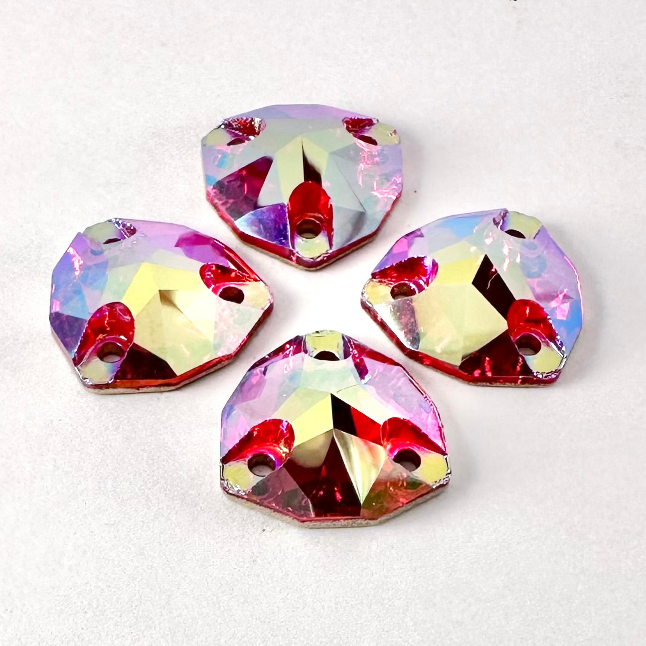 Each colour is presented with what looks like a coating of both cubic zirconia and an AB finish. Like colours with a CZ finish they stay true to their described colour, however as they also display an AB quality, they subtly throw an alternate reflected colour - and this varies depending on the shape chosen.