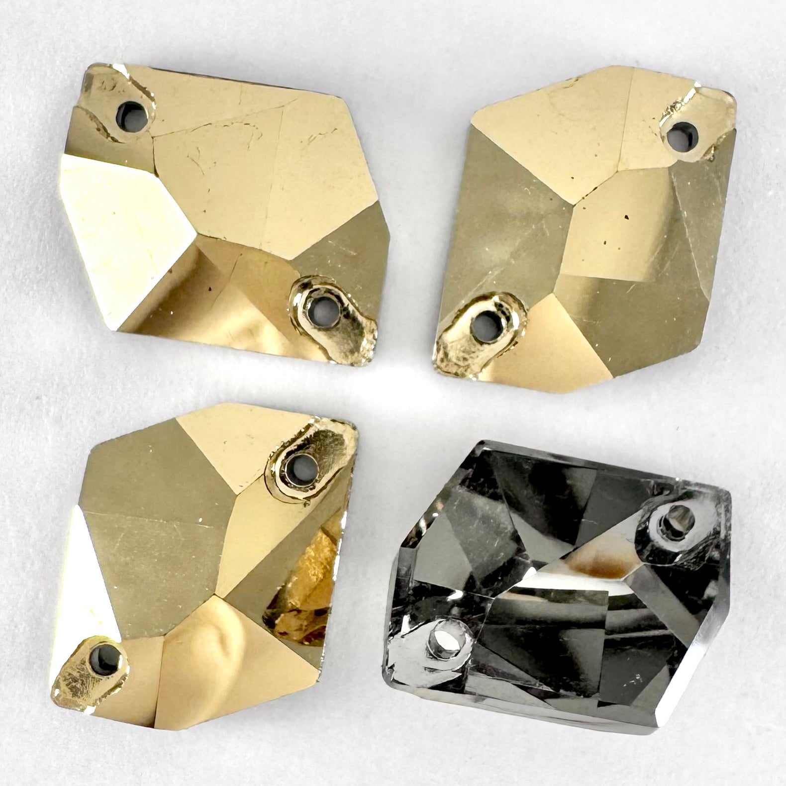 It is common for larger crystal shapes to appear slight different in colour than smaller shapes due to the amount of refracted light within the crystal. Any colour variation is much less pronounced once the crystals are put on fabric.